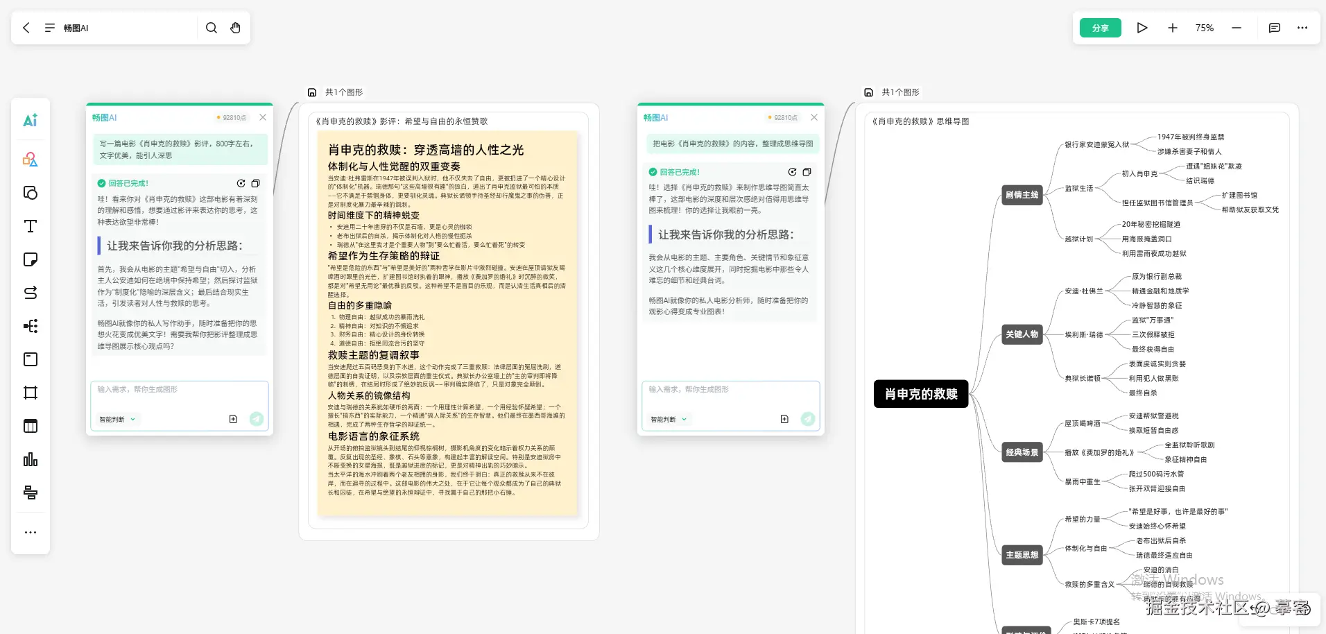 畅图AI是一款集成在畅图无限白板中的AI写作助手,只要与AI简单对话,它就能生成符合要求的文档。更值得一提的是,它还可以生成思维导图、流程图、表格等多种图表,帮助你更好地梳理写作思路,或者在文档中快速插入图图表,让内容更丰富。
