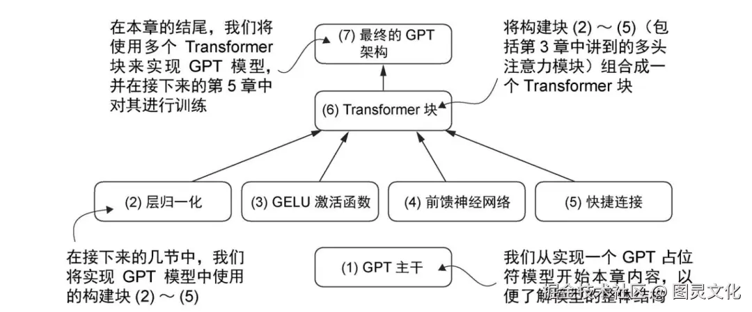 我们编写GPT架构的步骤是:首先从GPT主干入手,创建一个占位符架构;然后实现各个核心组件;最后将它们组装成 Transformer 块,形成完整的 GPT 架构