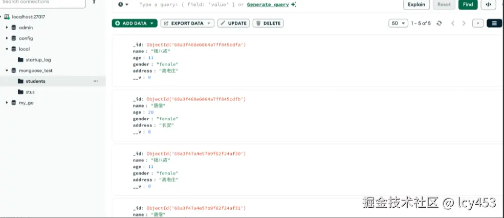 这里我们用model方法比如find.delete,findOneAndUpdate({},{})等对文档进行增删改查后,数据库对应model集合数据就会对应的增删改查。