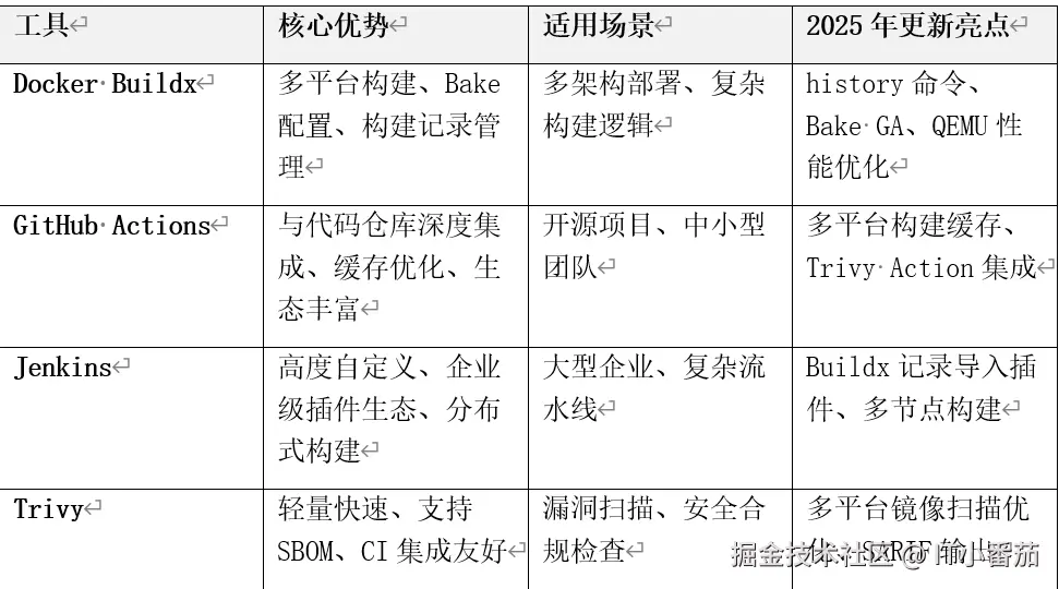Docker镜像的自动化构建已从"实现功能"迈向"优化体验与安全"。2025年Buildx的Bake功能和构建记录管理,解决了多目标构建和调试难题;Trivy与CI/CD的深度整合,将安全扫描嵌入流程早期;而非root用户、只读文件系统等实践,则构建了从构建到运行的全链路安全防护。