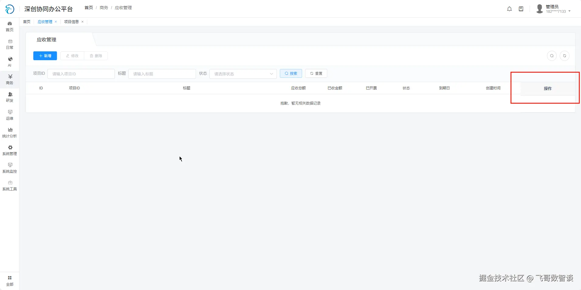 应收记录在项目创建之后在该模块中手动新增,一个项目可以创建多条应收。