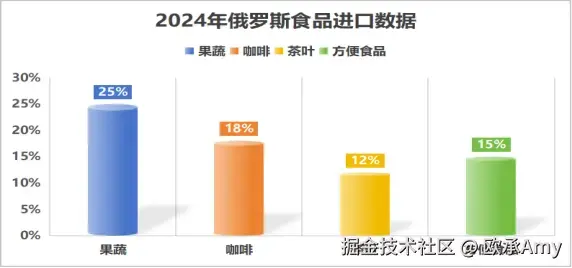 由于俄罗斯气候条件等因素影响,其食品生产主要集中在农业部门的原料生产上,如谷物、蔬菜、水果和畜禽养殖等,且进口食品数量相对较高。如热带水果、茶、咖啡、坚果等在国内无法生产的产品需要大量依赖进口。据俄罗斯联邦海关署数据,2024年俄罗斯食品进口额达320亿美元,其中果蔬、咖啡、茶叶、方便食品进口量同比分别增长25%、18%、12%、15%。