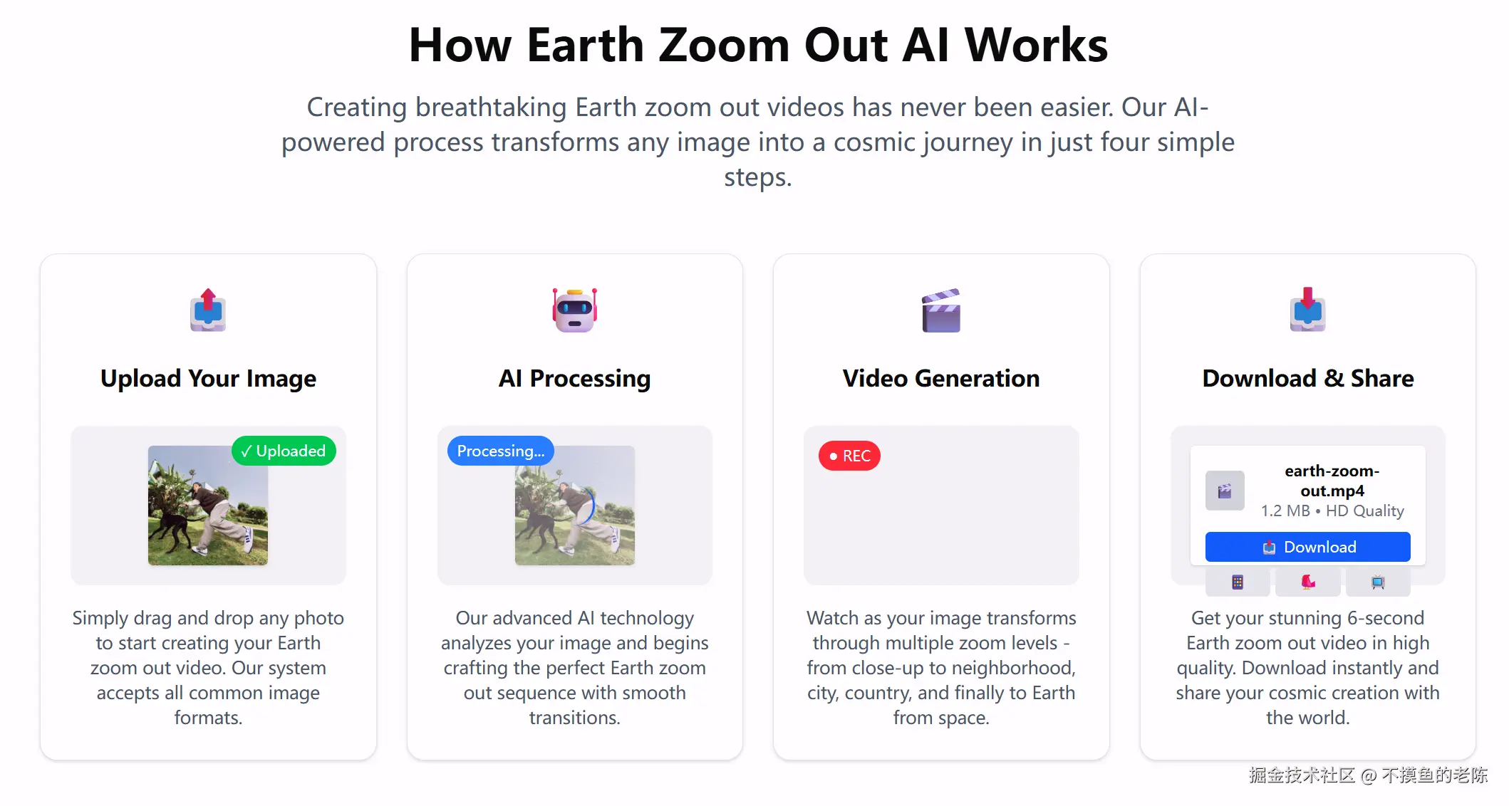 Earth Zoom Out AI是一款AI视频生成工具,将任何照片转换为电影般的6秒缩小视频,展示地球从太空的视角。