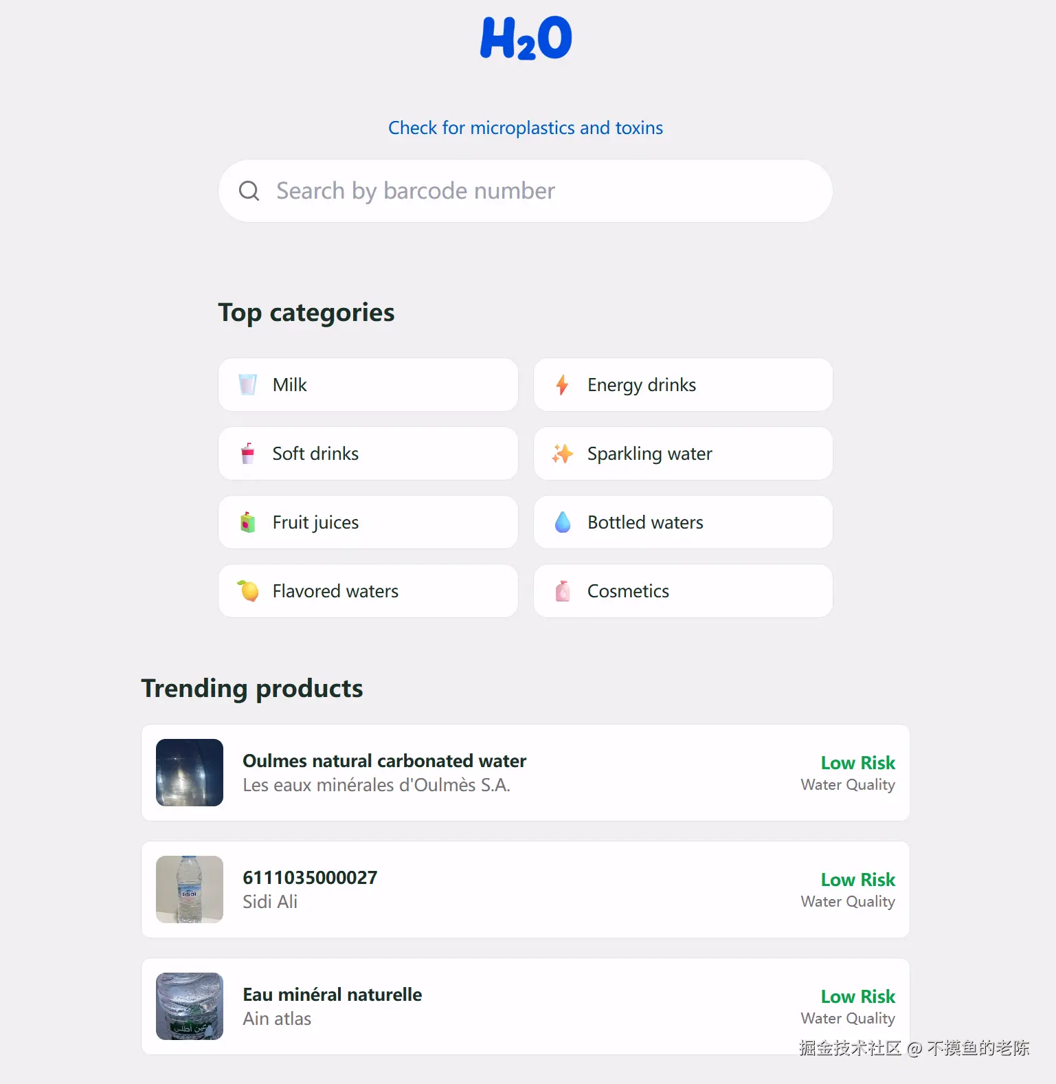 H2O是一款分析饮料和化妆品中微塑料和化学风险的Web应用,通过扫描产品名称或条形码获取微塑料风险评分及已知化学危害信息。