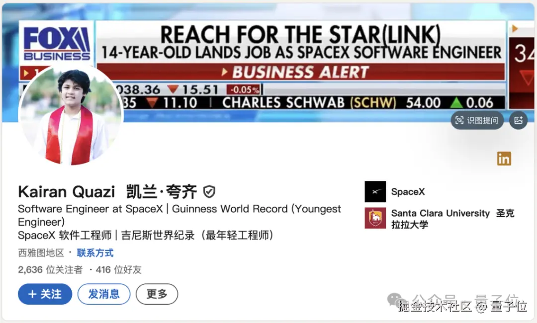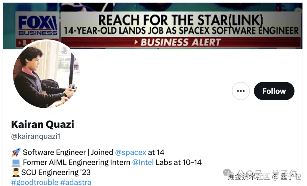 2 年前,14 岁的 Kairan Quazi 从圣克拉拉大学毕业,被马斯克 pick,加入入职成功率仅有 0.2% 的 SpaceX,成为 Starlink 部门最年轻的软件工程师——这是 SpaceX 工程密度最高的部门之一。