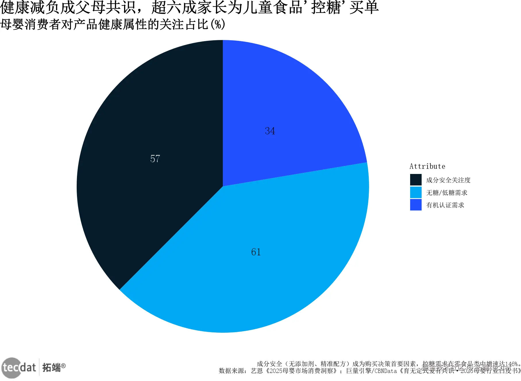图3:饼图(成分安全关注度57%、无糖/低糖需求61%、有机认证需求34%)