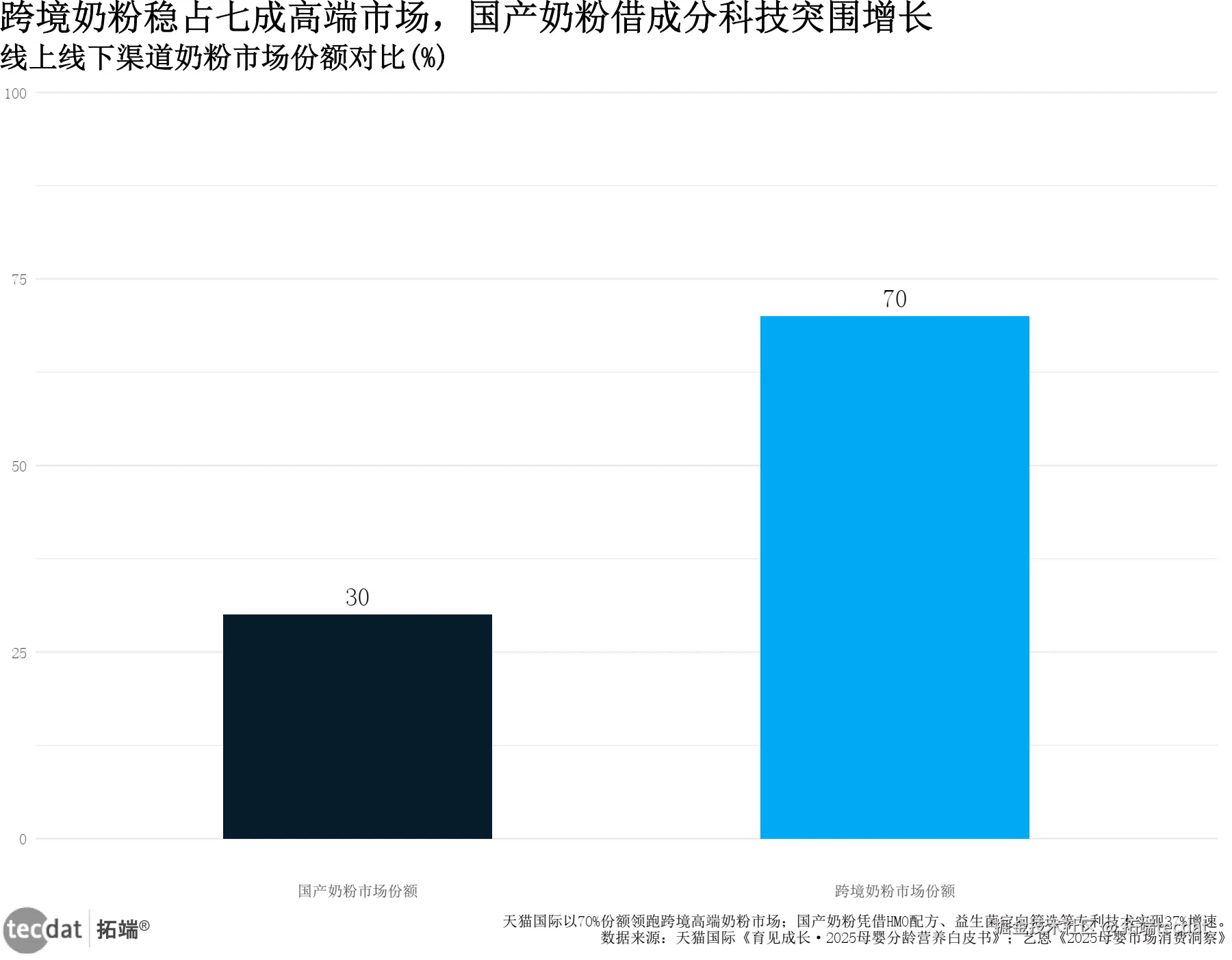 图6:双柱状图(跨境奶粉市场份额70%、国产奶粉市场份额30%)