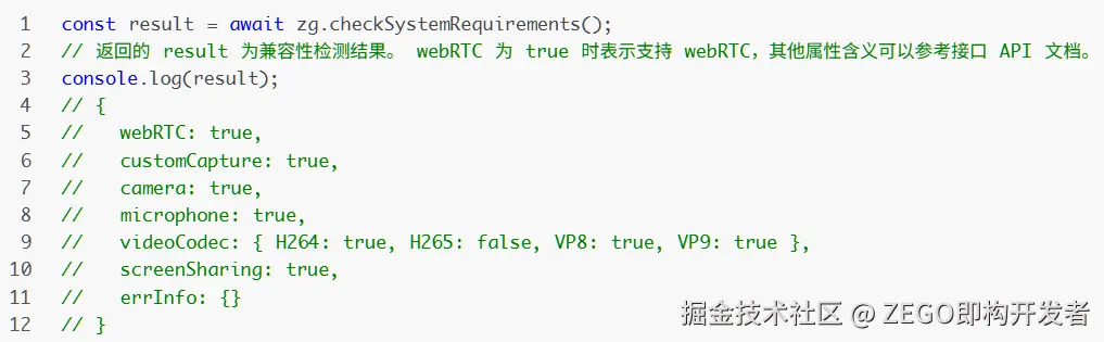 调用 checkSystemRequirements 接口检测浏览器的兼容性,检测结果的含义,请参考 ZegoCapabilityDetection 接口下的参数描述。