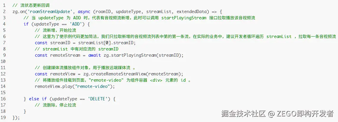 房间内有其他用户加入时,SDK 会触发 roomStreamUpdate 回调,通知房间内有流新增,基于此可获取其他用户的 “streamID”。此时,调用 startPlayingStream 接口根据传入的其他用户的 “streamID”,拉取远端已推送到 ZEGO 服务器的音视频画面。若需要从 CDN 拉流,可参考 使用 CDN 直播。