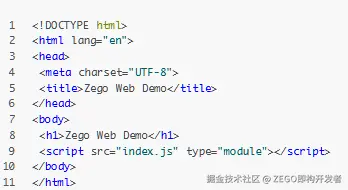 3.在index.html文件中编写界面代码,并在文件的 head 标签内使用 script 标签引入ZegoExpressWebRTC-x.x.x.js。其中,x.x.x为 SDK 的版本号,请参考第 1 步压缩包解压后的文件名修改。