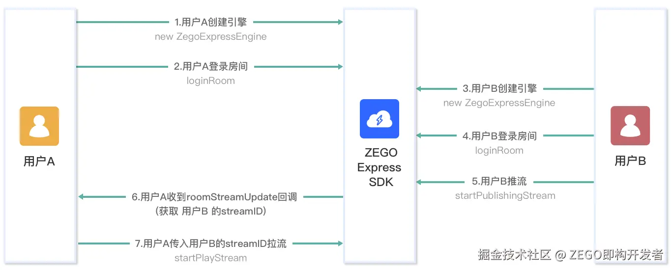 以用户 A 拉取用户 B 的流为例,一次简单的实时音视频通话主要流程如下: