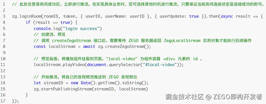 ②需等待 createZegoStream 接口返回 ZegoLocalStream 实例对象 localStream 后,再将自己的音视频流推送到 ZEGO 音视频云。
