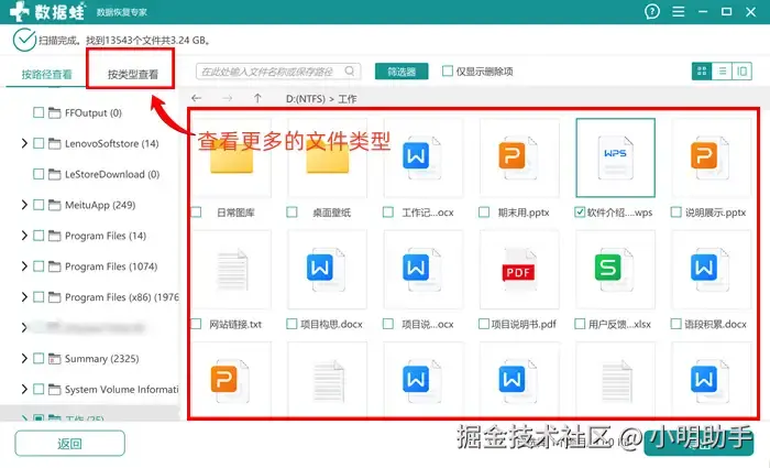 耐心等待扫描完成,该文件恢复软件能够找回的文件类型相当丰富,不信就瞧瞧左边的“按类型查看”目录,许多未曾谋面的文件类型都可以在此见识见识。