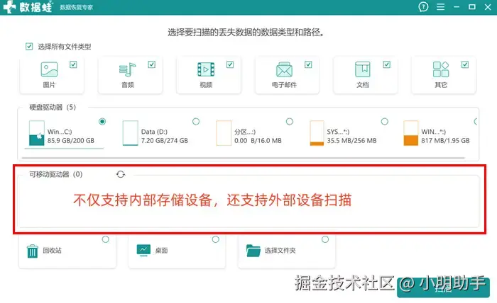 该扫描准备页面一目了然,我们需要在这里选择好目标数据的类型 (如果不确定文件类型或者说需要进行大量数据恢复,可以选择直接勾选左上角的“选择所有文件类型”) ,还需要选择需要扫描硬盘。这里还有“可移动驱动器”区域,如果我们连接上U盘或SD卡,也能够通过这款软件进行扫描了!