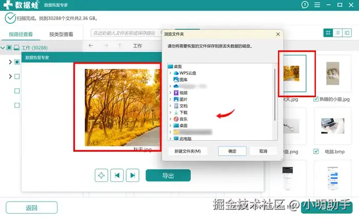 如果需要找回的文件为图片格式,可恢复图片中点击打开,高清预览图将会展开。直接点击下方的“导出”,就能揭晓最后步骤:选择文件合适的存储位置。至此,完成数据恢复的操作。