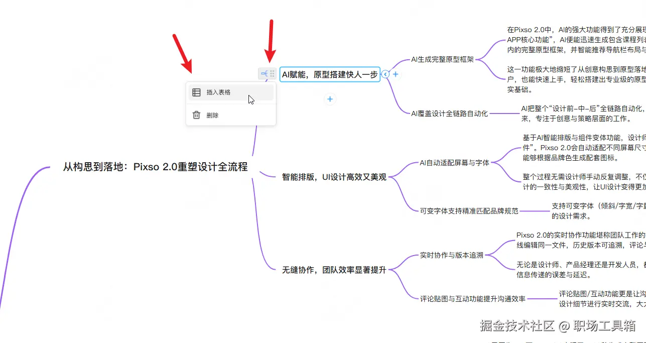 下图是基于思维导图视图来编辑PPT大纲的界面,点击导图第三层级的任意一个节点,在弹出的浮窗,选择“插入表格”,可将表格添加到PPT大纲,后续生成PPT时,Word包含的表格也会自动进入到PPT中。