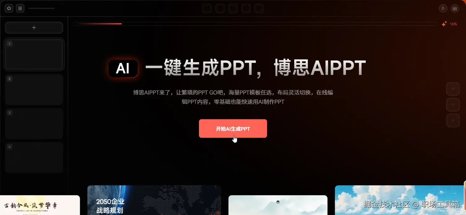 AI智能生成内容:只需输入演示主题,AI 会自动生成大纲、逐页内容,甚至推荐设计风格。