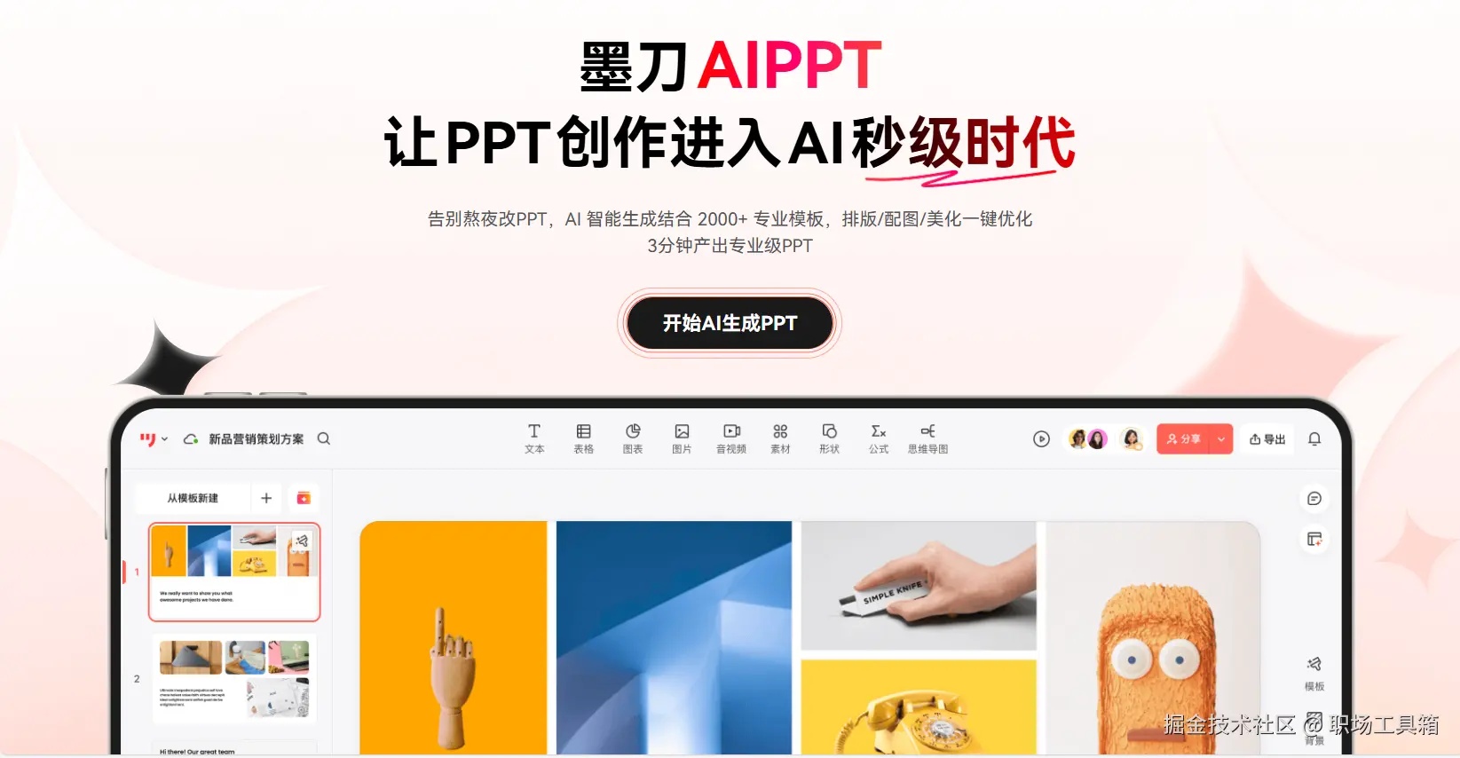 墨刀AIPPT的出现,让PPT创作进入AI秒级时代,AI智能生成结合内置的海量专业PPT模板,排版/配图/美化一键搞定,3分钟产出专业级PPT,非常适合产品经理、设计师、企业管理者和创业人士等使用。