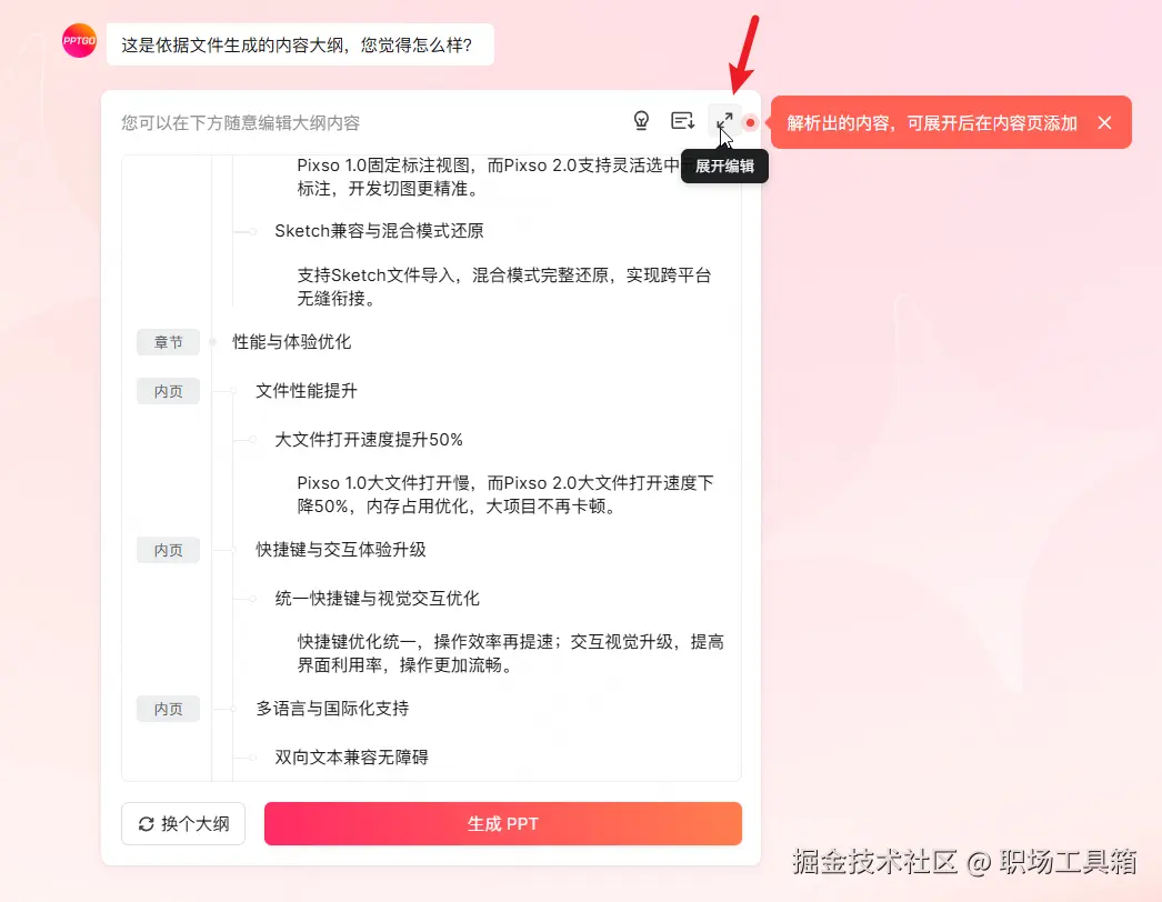 值得一提的是,如果你上传的Word文档包含表格或图片,可在得到PPT大纲后,点击大纲右上角的“展开编辑”按钮,进入大纲编辑视图。