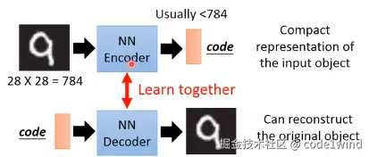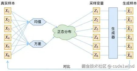 把一堆真实样本通过编码器网络变换成一个理想的数据分布,然后这个数据分布再传递给一个解码器网络,得到一堆生成样本,生成样本与真实样本足够接近的话,就训练出了一个自编码器(AE)网络。