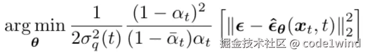 将模型改为去预测在前向时间步 t 所添加的高斯噪声 ϵ,模型输入是 xt和 时间步 t,预测结果为: