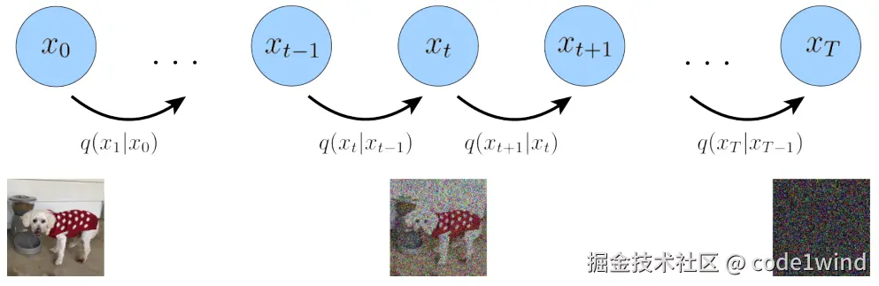 q(xt∣xt−1, x0): αtxt−1+1−αtϵ ∼ N(αtxt−1, 1−αt)