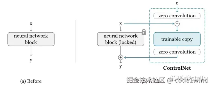 将我们需要修改的网络层复制一份,并在前后分别增加参数全为0的 卷积 层,作为右侧的 trainable分支。