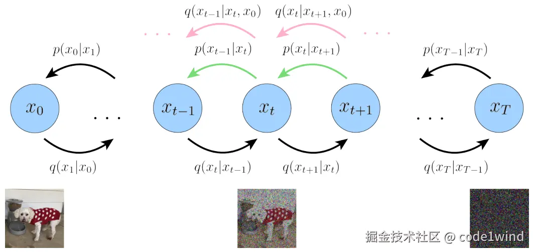 那么我们就构造一个高斯分布p(xt−1∣xt)(见绿色箭头),让其方差和后验分布q(xt−1∣xt,x0)一致: