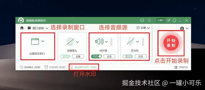 步骤2:进入 “窗口录制” 页面后,可以自主调节录制窗口的大小或范围,同时支持对摄像头、音频输入源等参数进行配置。如果你需要添加录制水印,直接在 “图片水印” 选项中完成自定义设置。待所有参数确认无误后,点击 “开始录制” 按钮启动录屏功能。