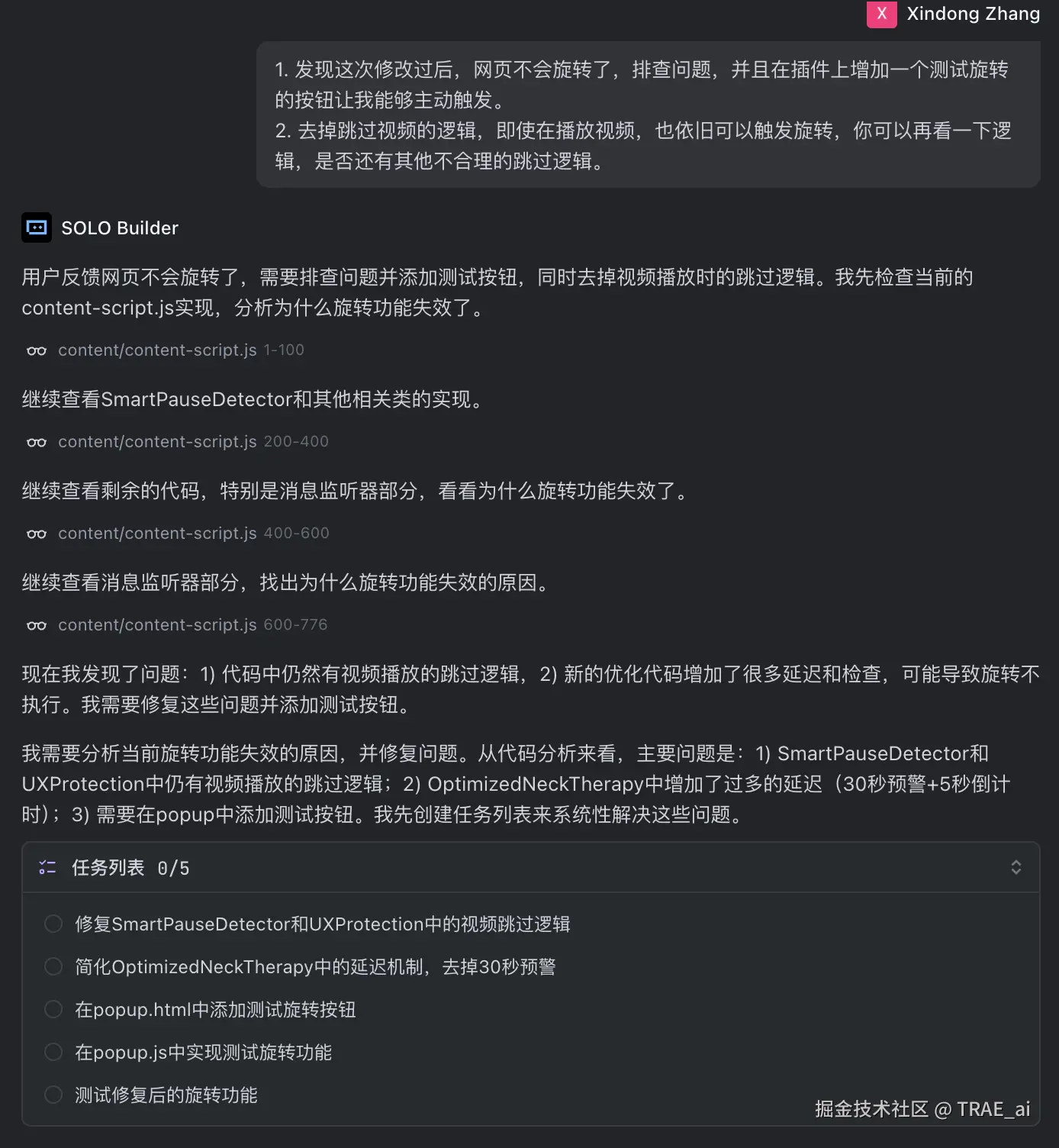 - 擅自采纳了方案 3,增加了 feature:当人正在打字或者观看视频时,跳过旋转避免打扰。这个 feature 倒也合理,但是问题是这个 feature 导致所有网页都识别成了视频页面(好像是靠 div 的关键词模糊匹配的)