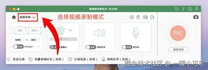 步骤1:启动Mac上的对应的数据 蛙录屏软件后,你会发现软件内置了多种录制选项,本次操作将选取 “视频录制” 模式来进行演示。
