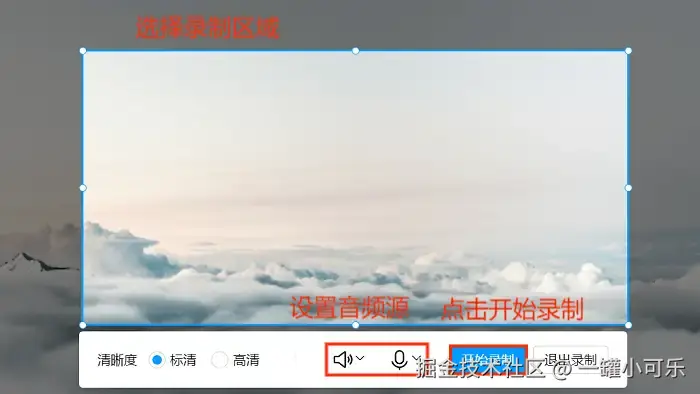 步骤2:选择录制的区域,录制的音频源后就可以点击 “开始录制” 去录制视频了。