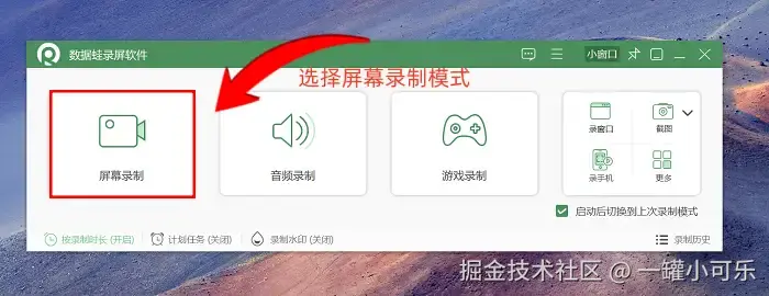步骤1:打开数据 蛙录屏软件,首页面会展示多种录制模式,有屏幕录制、音频录制、游戏录制等。我们可以根据实际需求选取,这里以 “屏幕录制” 功能为例进行操作演示。
