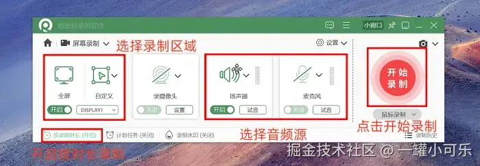 步骤2:进入 “屏幕录制” 页面后,可以自主调节录制区域的大小或范围,同时支持对摄像头、音频输入源等参数进行配置。如果你想设置录制时长,只需要打开 “按时长录制” 进行设置就可以了。所有的参数都设置好后,点击 “开始录制” 按钮启动录屏功能。