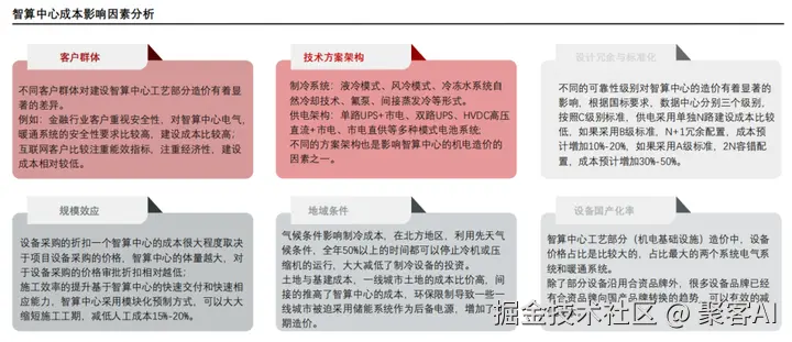 成本影响因素包括客户需求(如冗余等级)、技术方案(液冷vs.风冷)、规模效应和区位(电价差异),智算中心造价高度定制化。