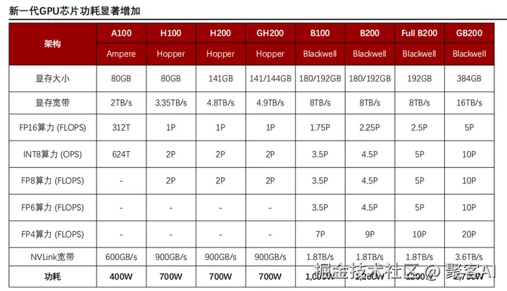 - 算力指标:FP8/FP6低精度性能指数级增长(如Blackwell FP4算力达10 PetaFLOPS),优化推理效率。
