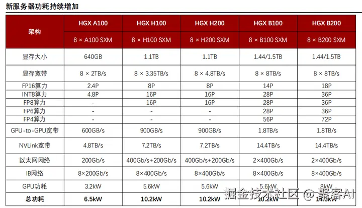 - 功耗激增:单芯片功耗从A100的400W增至GB200的2700W,对散热和供电提出极限要求。