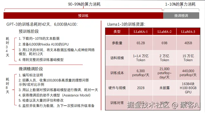 - GPT-3:在6,000块A100 GPU上耗时34天完成预训练,微调额外8天。