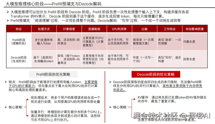 - Prefill阶段:一次性并行处理所有输入Token,构建完整的KV缓存,实现上下文“速读”。此阶段GPU计算密集,需最大化并行吞吐。