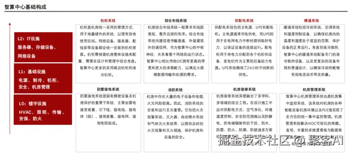 智算中心基础构成:包括供配电(双路冗余UPS)、制冷(液冷系统为主)、机柜(高密度部署)、防雷防火等子系统,确保99.99%可用性。核心设计原则是高能效比和可扩展性。