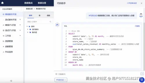 基于深度语义理解技术解析业务意图,结合行业元数据和标准代码模版等行业知识,一键生成Hive/Python/Shell等全场景代码。其中行业知识包括:基于数百个数据治理项目经验,沉淀的应急、政务、零售等行业元数据,以及内置全删全插、动态分区初始化、增量比对追加、全量比对追加等9类高频数据开发代码模版,确保自动生成的代码更精准。