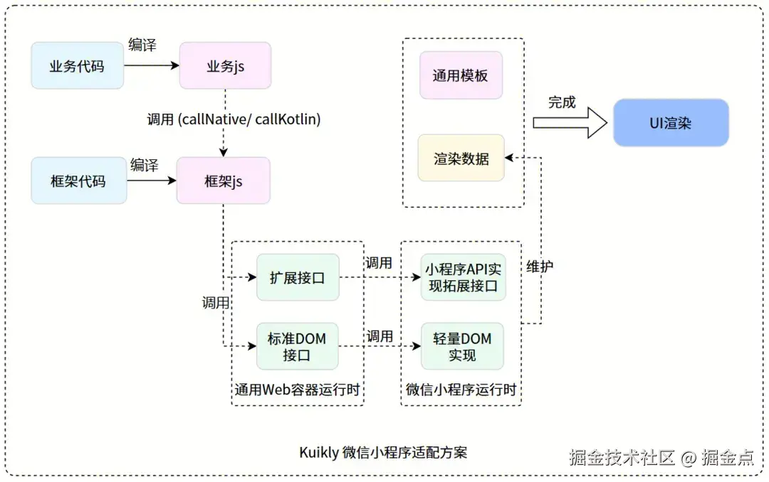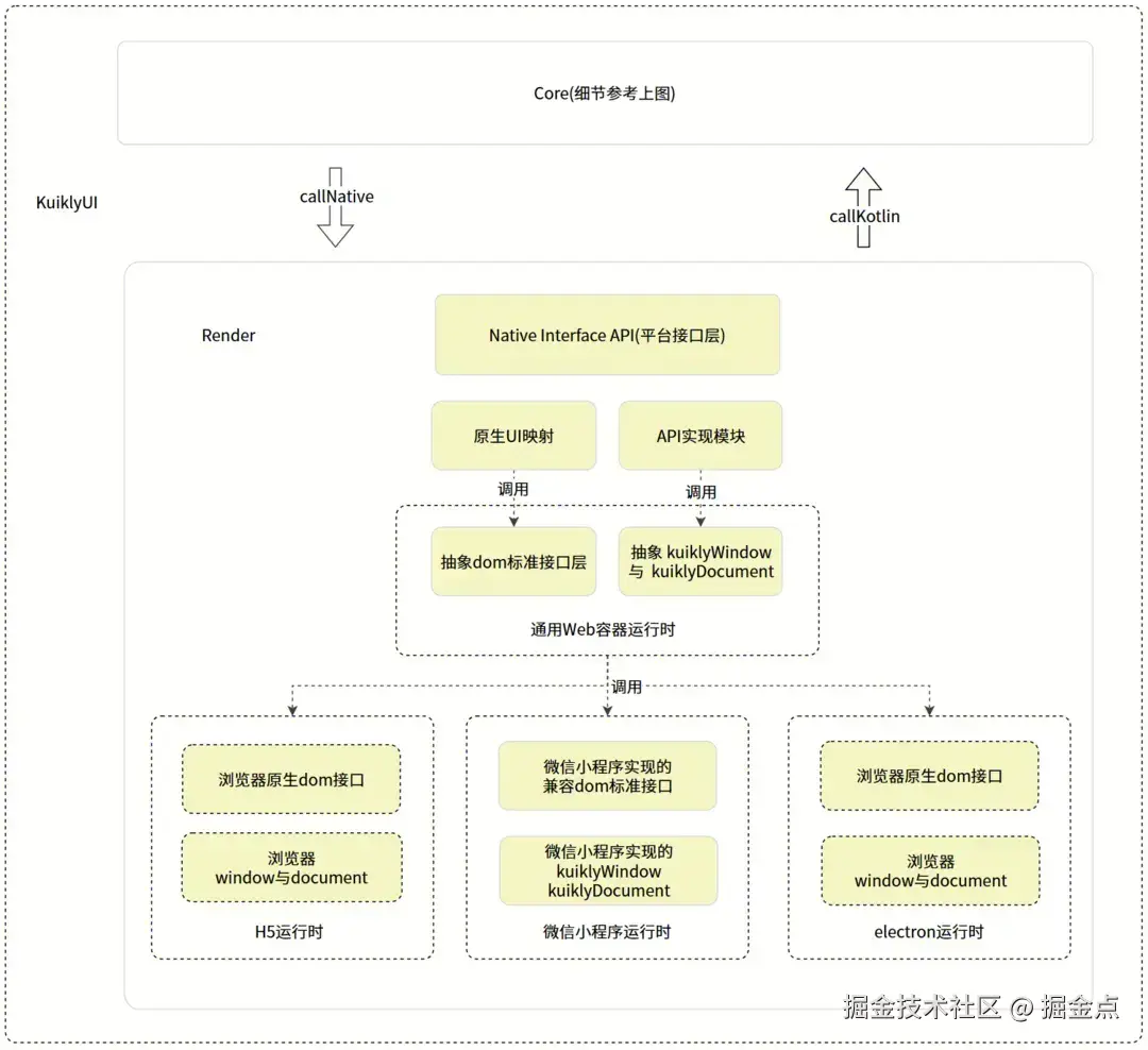 在进行Kuikly Web版H5和微信小程序适配工作时,我们发现许多代码可以共用,因此我们抽象了一个Web容器运行时作为适配层,这个适配层依赖抽象的DOM API、KuiklyWindow、KuiklyDocument,实现了绝大部分Render逻辑。