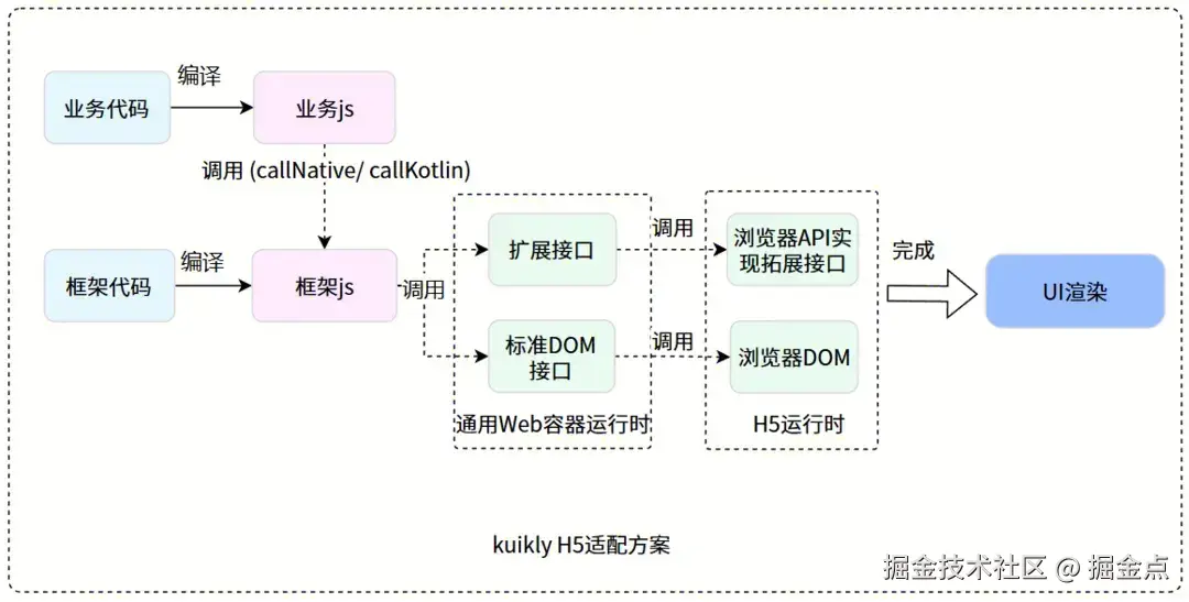 浏览器提供了标准的DOM,Window,Document。Kuikly适配H5时只需实现动画,滚动列表,文本测量等少部分 Web容器运行时拓展接口。