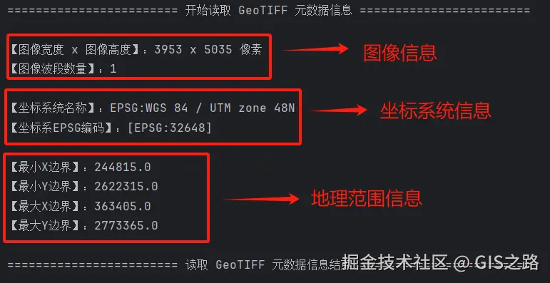 代码主要包括三个部分,分别是【读取图像信息】、【读取坐标系统信息】以及【读取地理范围信息】