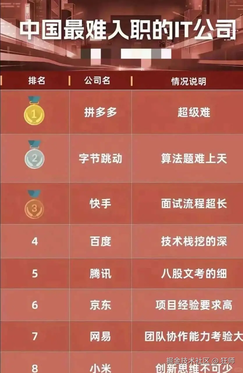 年初的时候,发表过一篇关于:中国最难入职的IT公司排行榜! 的文章,阅读量3天破了20W+,引发了读者广泛的热议。 半年过去了,今天接着这个话题,再来聊一聊。