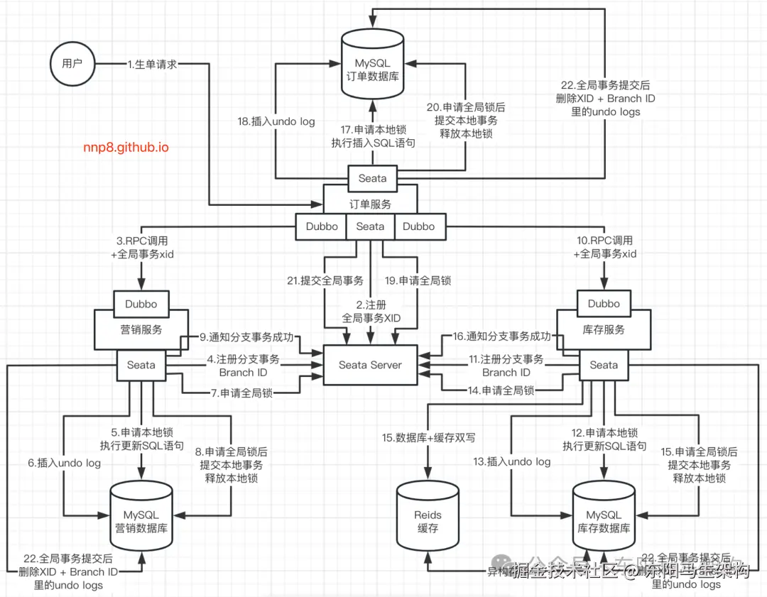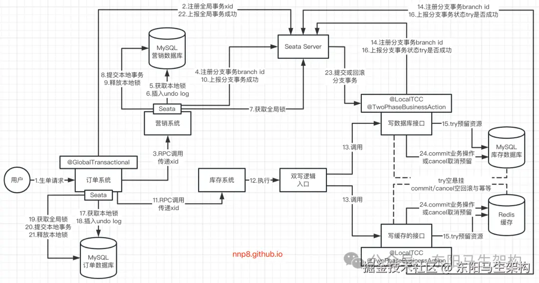 (1)生单链路使用Seata AT分布式事务的原理流程图