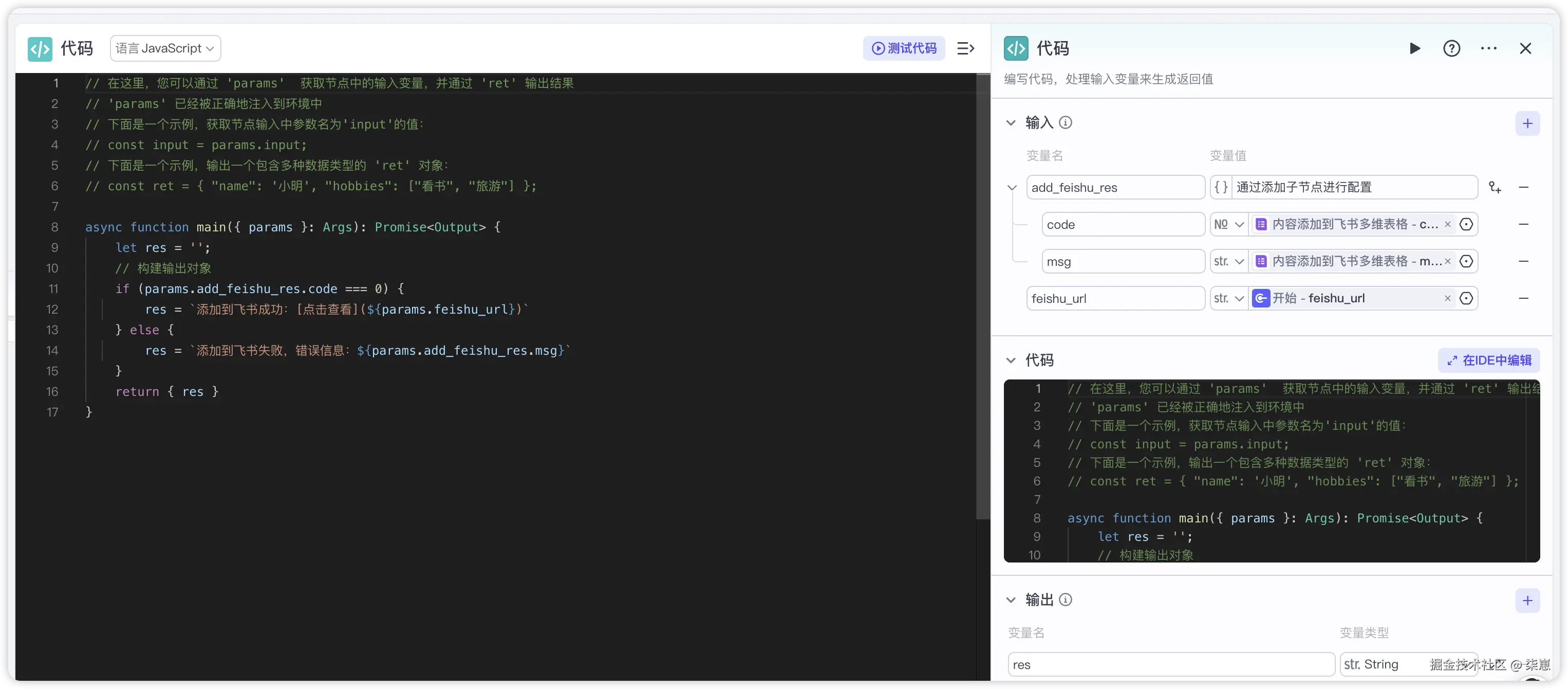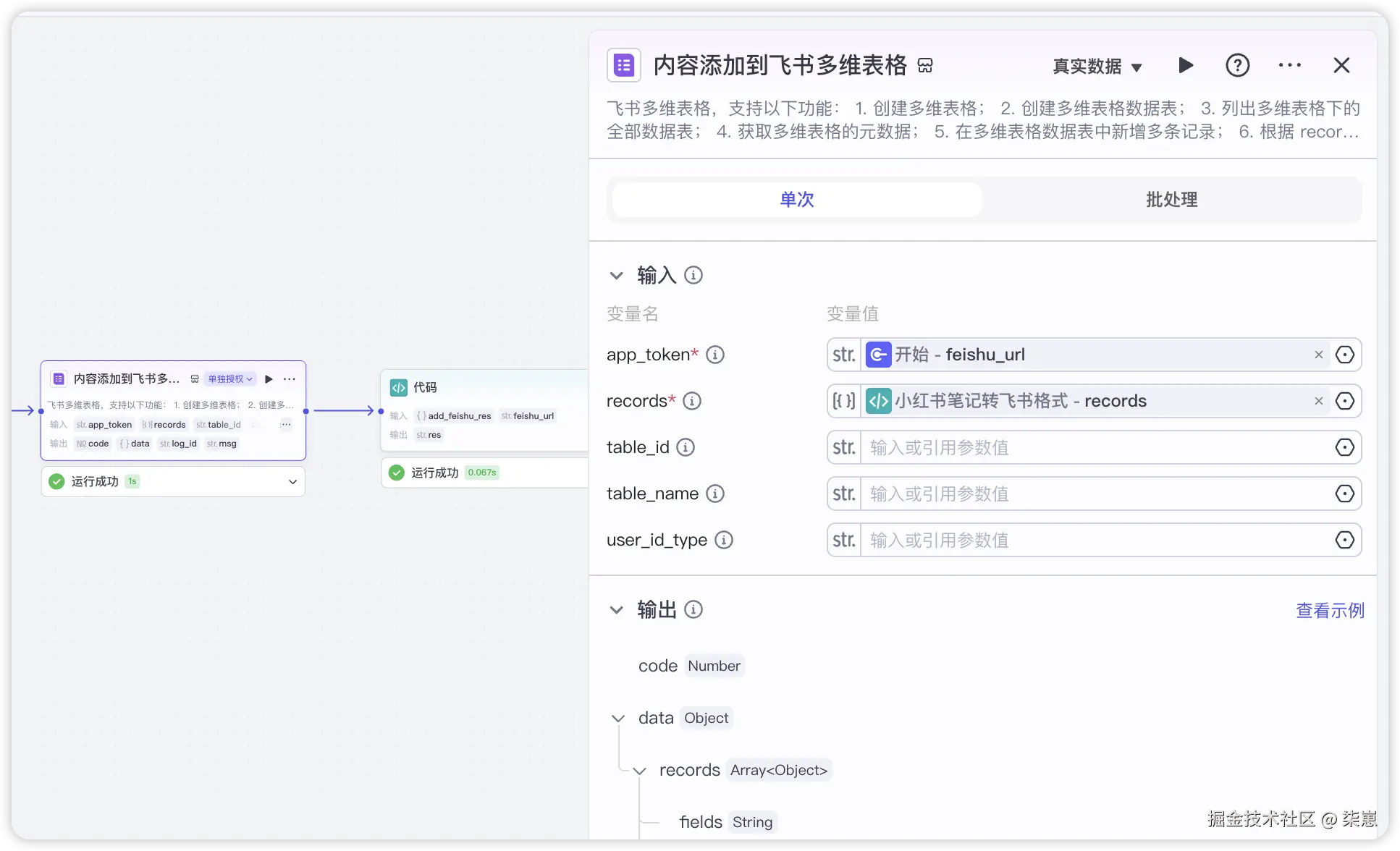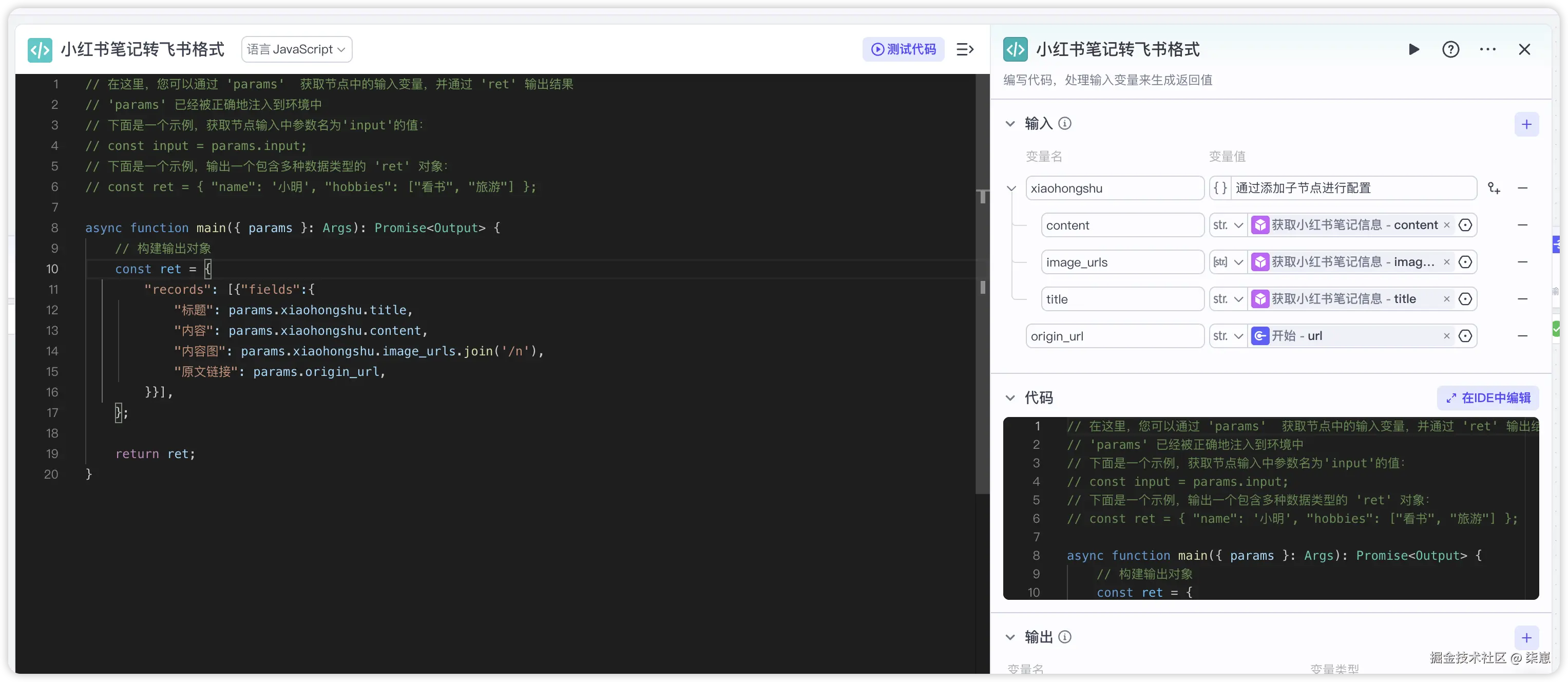 这是一个代码节点,主要是将多维表格内容格式化成飞书表格的格式。