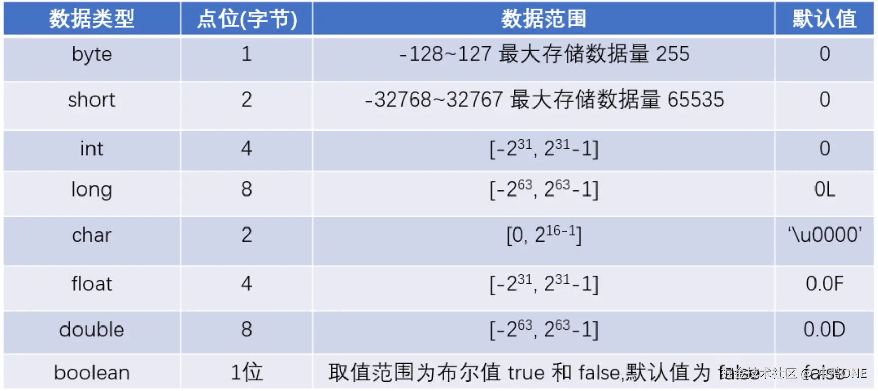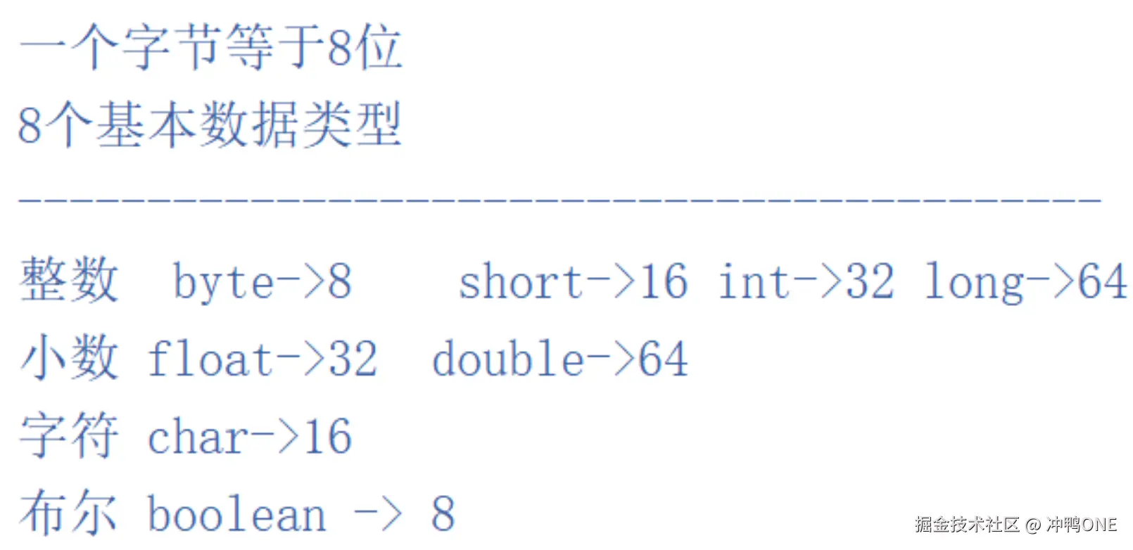 - 8 个基本数据类型分别占用内存空间大小。