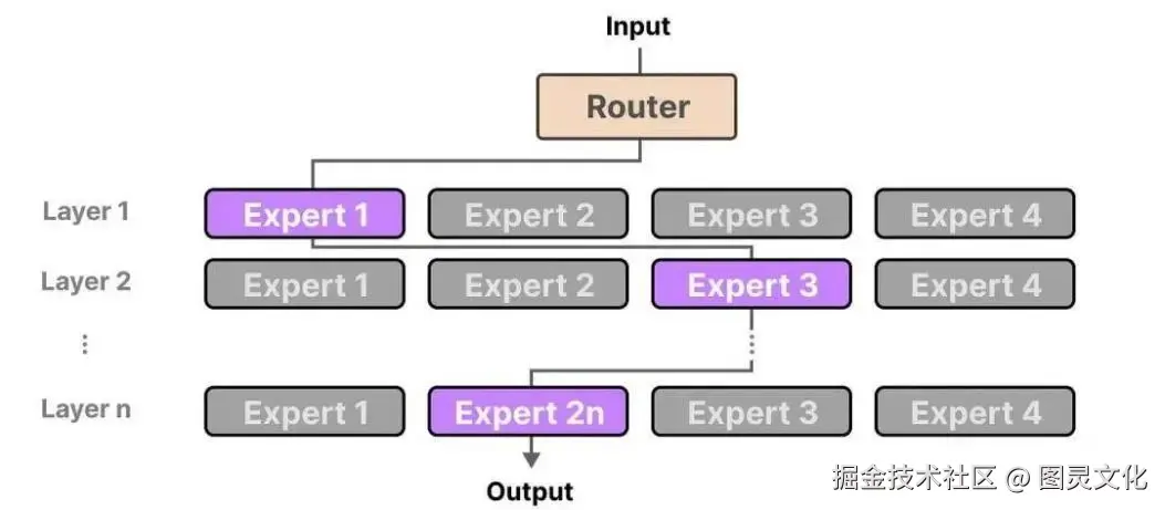 另外混合专家的路由器(Router**)输出概率,用于混合专家(MoE)模型选择最佳匹配专家(Expert),选择的专家(Expert)也是一个前馈神经网络(FFNN)。