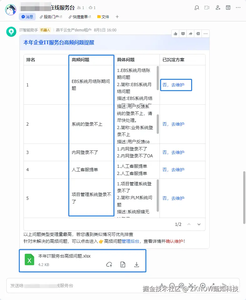 基于对企业运维痛点的深度洞察,甄知科技燕千云ITSM的基于强大的数据分析能力与知识管理体系,推出**“高频重复问题自动总结推送”**的全新功能。